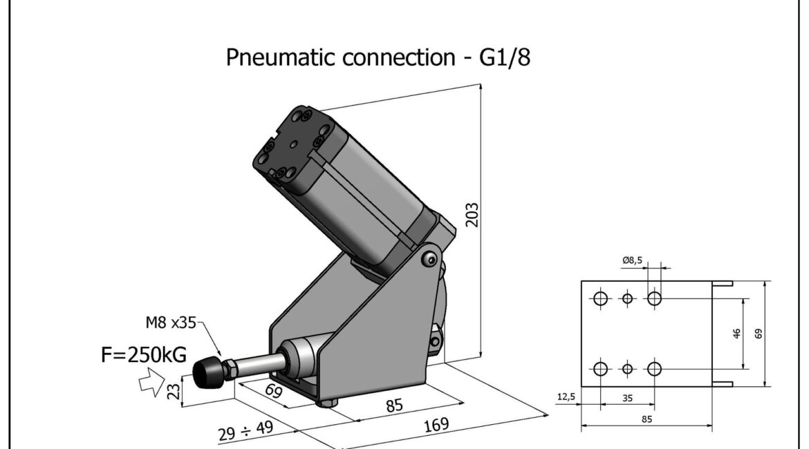 Sauterelle pneumatique Ă pousser-tirer Ă fixation Ă plat. Verin Pneumax vertical