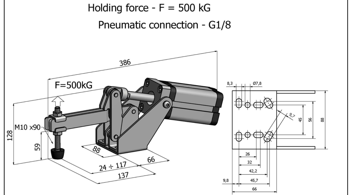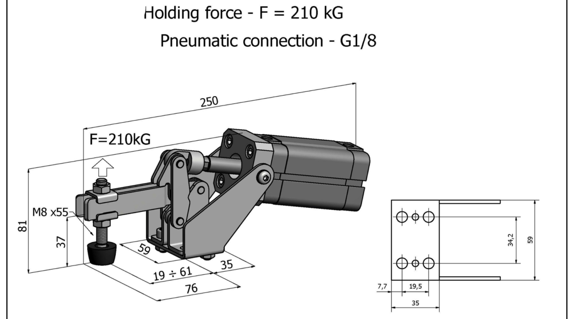 Sauterelle pneumatique verticale Ă fixation Ă plat. Verin Metal-Work horizontal