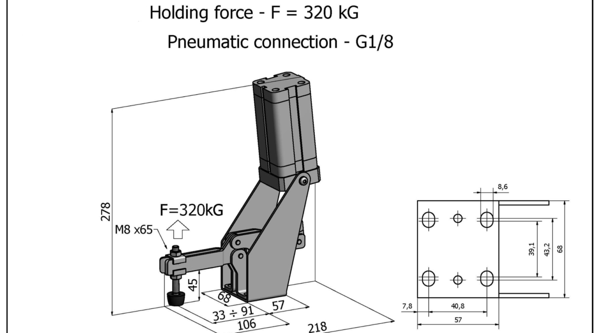 Sauterelle pneumatique horizontale Ă fixation Ă plat. Verin Pneumax vertical