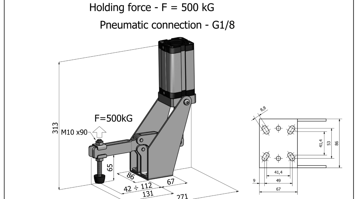 Sauterelle pneumatique horizontale Ă fixation Ă plat. Verin Metal-Work vertical